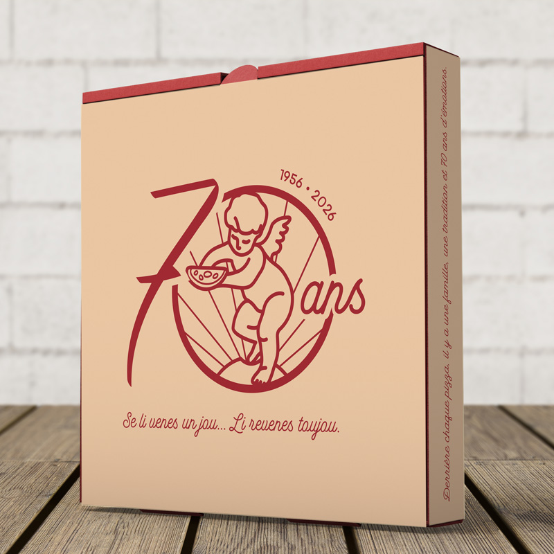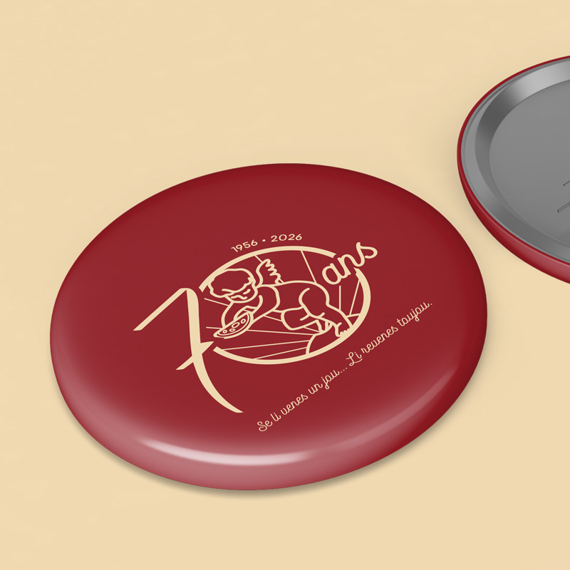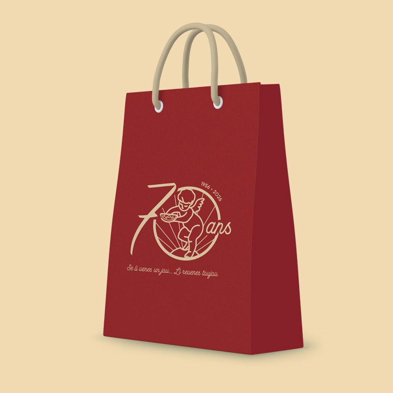 Le célèbre angelot, symbole iconique de la marque, s’intègre naturellement au chiffre 70, dans un jeu graphique subtil et chaleureux.